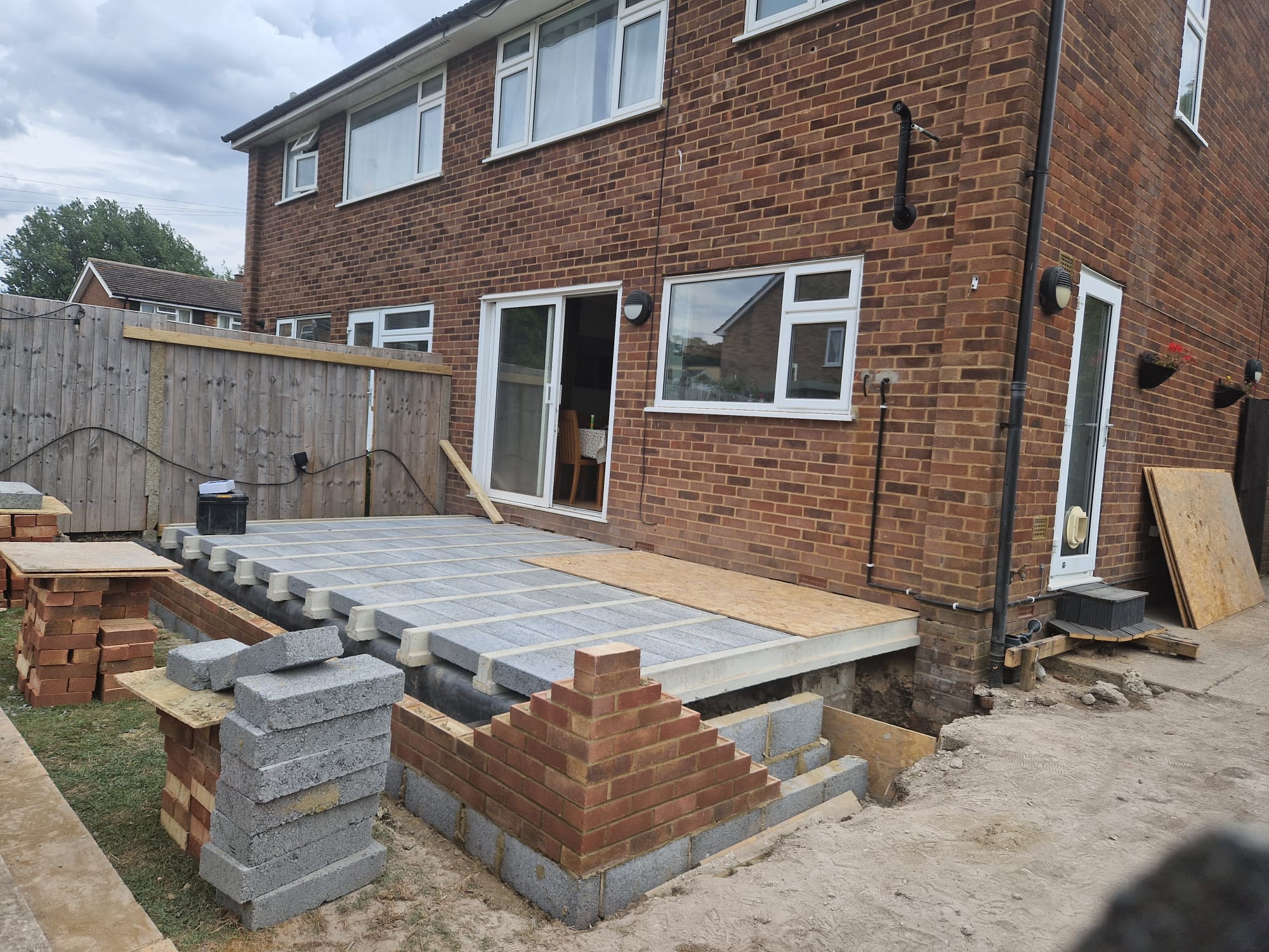 Located in Hazlemere, near High Wycombe, this single-story kitchen extension transformed a family home with a spacious, modern, and functional living space. The project began with careful excavation of the footings, followed by the installation of a durable block and beam floor, providing a solid foundation for the new extension. The brickwork was constructed to match the existing property perfectly, ensuring a seamless integration with the original home.